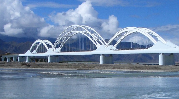 拉薩河特大橋是青藏鐵路的標(biāo)志性工程,全長928.85米,最大跨度為108米 ,主橋采用五跨連續(xù)橋梁和中間三跨連續(xù)鋼拱組合體系,主跨采用雙層彎拱結(jié)構(gòu),這兩項均為國內(nèi)首次使用,在同類橋梁中處于世界領(lǐng)先、亞洲第一的地位。該橋的主橋橋墩設(shè)計為牦牛腿式變截面雙圓柱墩,引橋橋墩設(shè)計為雪蓮花式變截面圓端形墩。大橋設(shè)計結(jié)構(gòu)新穎,融民族特色與現(xiàn)代風(fēng)格于一體,建成后大橋通體白色,連續(xù)的拱形猶如一條飛揚(yáng)的哈達(dá)與金色的布達(dá)拉宮遙遙相望。