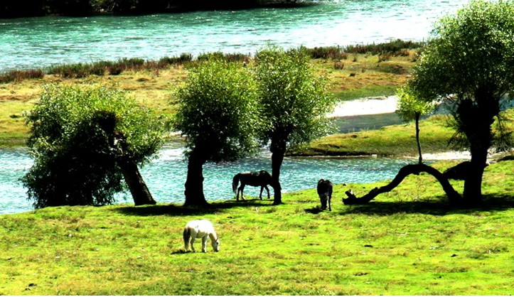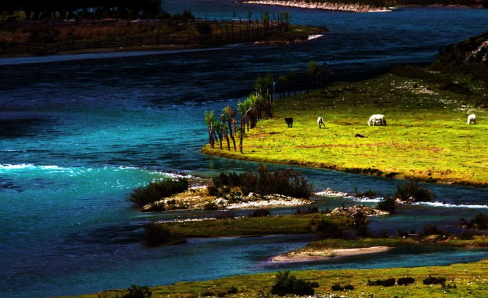 尼洋河在源頭是一條細(xì)流,它奔流向前,越流越急。它要沖破各種阻力和障礙,不急不行。到了中游以下,河面已越流越寬,水流也漸漸平緩了下來(lái)。這時(shí)的尼洋河已漸入佳境,河水中,可以看到對(duì)岸青山綠樹(shù)的清晰倒影了。天上的白云也到尼洋河里來(lái)游蕩,它們?cè)诤永锱獫窳艘律溃患患紥斓教焐先チ罆?。這時(shí)想到一個(gè)詞:行云流水。這是一種難以言語(yǔ)的美妙境界,創(chuàng)造這個(gè)美妙詞匯的人,當(dāng)他獲得靈感的那一刻,我想他的心靈肯定已和大自然的美景融為一體了。