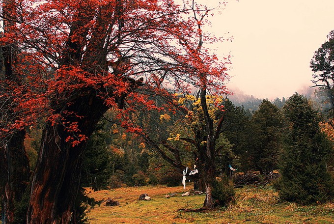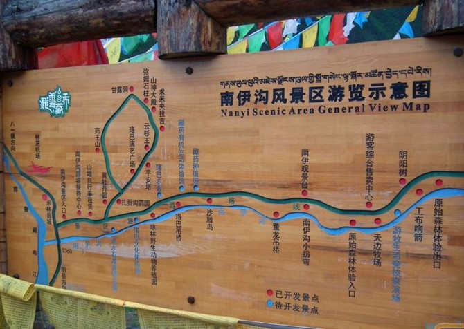 美麗的南伊溝離米林縣城有20公里,縱深40多公里,溝內(nèi)景色綺麗,有保護完好的天然原始森林和植被,既有高大的針潤葉混交林,又有牧草豐盛的草甸。群山環(huán)抱,云霧繚繞,春天滿山的桃花杜鵑,秋天滿山的紅葉。景區(qū)內(nèi)有珞巴民俗村、藏藥觀賞園、千年云杉王、扎貢原始森林、甘露洞(藏醫(yī)藥鼻祖玉妥•云丹貢布大師行醫(yī)授徒之地)等景點。