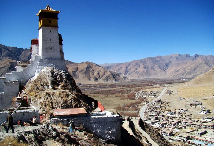雍布拉康,藏語(yǔ)意為“母子宮”,是西藏歷史上第一座宮殿,也是西藏最早的建筑之一,位于山南地區(qū)澤當(dāng)鎮(zhèn)東南,高聳于雅礱河?xùn)|岸扎西次日山頂。相傳是苯教徒于公元前2世紀(jì)為第一代藏王聶赤贊普建造,后來(lái)成為松贊干布和文成公主在山南的夏宮,五世達(dá)賴(lài)時(shí)改為黃教寺院。 雍布拉康主要供奉釋迦牟尼佛像。宮殿內(nèi)的壁畫(huà)上生動(dòng)地描繪了西藏的第一位國(guó)王,第一座建筑,第一塊耕地的歷史故事。 雍布拉康分為兩部分,前部是一幢多層建筑,后部是一座方形高層碉堡望樓,與前部相連。公元5世紀(jì),藏王托托念贊時(shí)期,傳說(shuō)一本佛經(jīng)從天而降,正好跌在雍布拉康宮頂,當(dāng)時(shí)無(wú)人能識(shí)。有圣人斷言,到了公元7-8世紀(jì)就有人能解讀此書(shū)。所以這本書(shū)被很好地保留在雍布拉康。