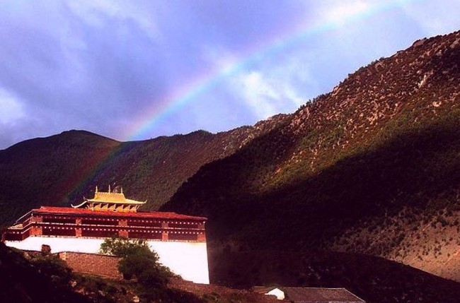 雍布拉康位于澤當(dāng)11公里的扎西次日山上。“雍布”意為“母鹿”,因扎西次山形似母鹿而得名,“拉康”意為“神殿”。雍布拉康是西藏歷史上第一座宮殿。據(jù)史書(shū)記載始建于公元前二世紀(jì)。松贊干布暑期由宮殿改作寺廟。文成公主初來(lái)西藏時(shí)每到夏季都會(huì)和松贊干布來(lái)這里居住。至五世達(dá)賴(lài)時(shí)又在原碉樓式建筑基礎(chǔ)上修了四角攢尖式金頂,并將其改為黃教寺院。