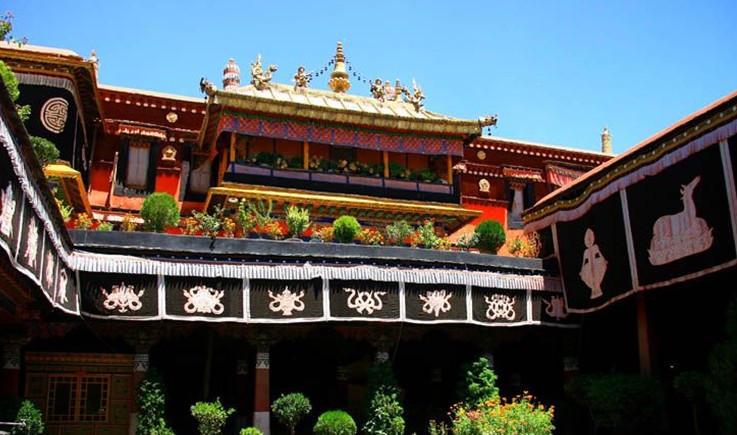 雍布拉康坐落在澤當鎮(zhèn)東南約5公里的扎西次日山上,是西藏最早的宮殿。雍布拉康已有2100多年的歷史,3曾建筑。一層的前半部為門廳,面積33平方米,門廳處是一個帶檐的小平臺。后半部是佛殿,供奉松贊干布、文成公主等塑像。第二層亦分前后兩部分,前半部分為三面環(huán)繞矮墻的平臺,后半部是帶天井的回廊。五世達賴喇嘛時在碉樓的頂部加蓋了四角攢尖式金頂。雍布拉康除部分僧房外,還有一間曾供歷代達賴喇嘛來此禮佛時居住的臥室。