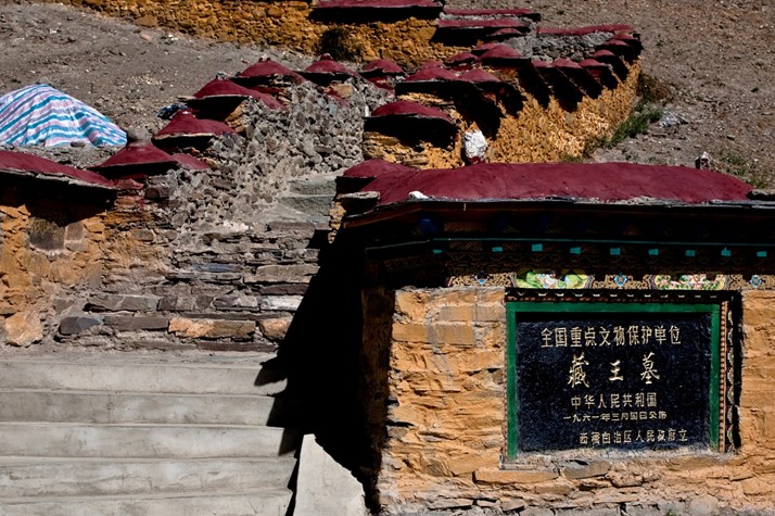 藏王墓屬全國重點(diǎn)文物保護(hù)單位,位于山南窮結(jié)縣宗山的西南方,背靠丕惹山(意為增長之山),是吐蕃王朝時(shí)期第29代贊普至第40代(末代)贊普、大臣及王妃的墓葬群,總面積385平方米。各陵墓封土高大,為土壘成的高臺丘墓。其上層土墩為橢圓形,墩頂極平坦,東西長約130米;下層為長方形土臺,周邊不齊整。藏王墓的數(shù)目現(xiàn)難確定,能看到的有八九座。靠近河邊的大墓據(jù)說是松贊干布之墓,與之相鄰的是赤松德贊的墓,墓旁有巨大功德碑。在9世紀(jì)中后發(fā)生的奴隸起義中,贊普陵墓全被搗毀,現(xiàn)在的藏王墓只是衣冠冢而已。