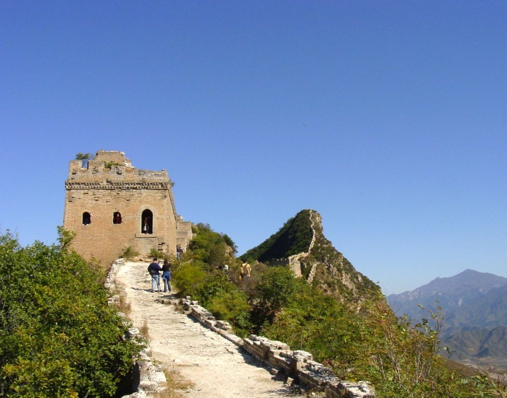 長城的最高處為“仙女樓”,需登“天梯”而上。天梯高達100米,坡度85度,幾近垂直,無膽量的絕難征服。仰頭上望,那磚石砌就的臺階僅可容腳,兩側(cè)懸崖陡壁,中間這一道臺階細如線,薄如刃,陡如立,不由人望梯興嘆,倒吸一口涼氣。爬上仙女樓,景色果然更加壯美秀麗,俯首看腳下的懸崖,刀削斧劈一般,幾縷霧嵐掛在絕壁處,更顯得陡峭驚險。西北邊金山嶺長城與司馬臺長城渾然一體,活象一條即將騰飛的蒼龍。長城上大小不同、形態(tài)各異的敵樓,恰到好處地建立在各個制高點上,威風(fēng)凜然,冷峻挺拔。整段長城,完美和諧,氣勢磅礴,處處顯示出她的巧妙、奇特、雄偉和壯麗。再看看連綿不斷的燕山山脈奔涌而起,疊起無數(shù)的奇幻;看看遼闊的華北平原無邊無際,一直鋪向目不所及的天邊,在這博大奇異的景色中,令人不由浮想聯(lián)翩。