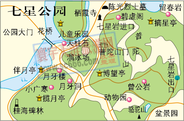七星公園因山而得名,它薈集了山、駝峰、普陀山、七星巖、月牙山以及桂海碑林等,是人們的必游之地。風(fēng)景區(qū)內(nèi)主要旅游景點(diǎn):