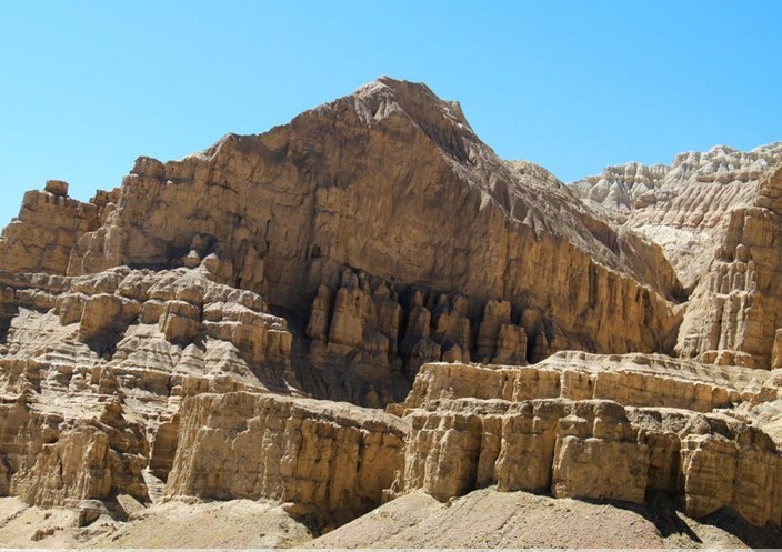 扎達(dá)土林面積達(dá)數(shù)百公里之闊,其地貌在地質(zhì)學(xué)上稱河湖相。專家考證,一百多萬年前,扎達(dá)到普蘭之間是個方圓500多公里的大湖,喜馬拉雅造山運(yùn)動使湖盆升高,水位線遞減,逐漸沖磨出“建筑物”惟妙惟肖的形狀與層高,數(shù)十萬年風(fēng)雨的侵蝕,猶如神工鬼斧不間斷的雕琢打磨,更使他玲瓏剔透出神入化。