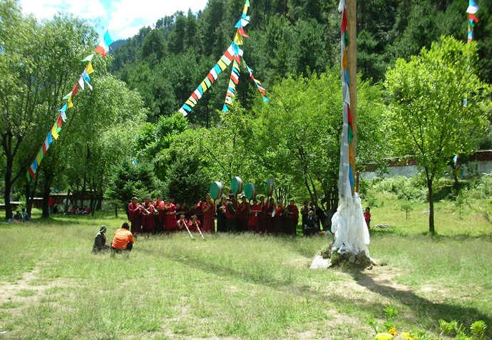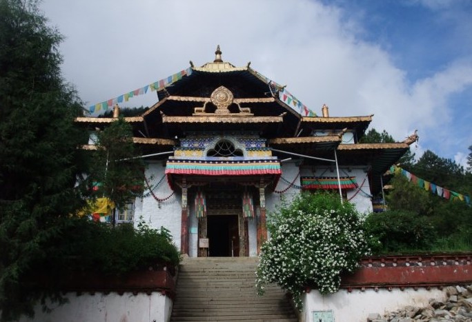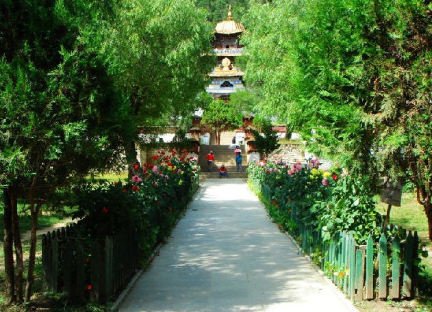 喇嘛嶺寺位于西藏林芝地區(qū)所在地八一鎮(zhèn)東南三十公里處的森林包圍的山坳里。喇嘛嶺寺的金頂與翠綠的松柏交相輝映。寺院經(jīng)堂和僧舍四周,各種顏色的菊花、格?;?zhēng)相斗艷,鐃跋聲、鈴鼓聲以及渾厚而又清脆的誦經(jīng)聲回蕩在山谷。這座建于上個(gè)世紀(jì)三十年代末的古剎,屬藏傳佛教四大教派之一的寧瑪派(俗稱(chēng)紅教)寺廟。