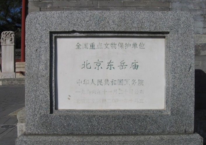全國(guó)重點(diǎn)文物保護(hù)單位。位于北京市區(qū)東部朝陽(yáng)區(qū)朝陽(yáng)門(mén)外神路街。占地約6萬(wàn)平方米,是道教正一派在華北地區(qū)最大的廟宇。始建于元延?六年 (1319),由玄教大宗師張留孫和其弟子吳全節(jié)募資興建。至治三年(1323)完工,賜名東岳仁圣宮,主祀泰山神東岳大帝。清道光年間擴(kuò)建。廟坐北朝南,由正院、東院、西院三部分組成。正門(mén)前有高大雄偉的三洞七幢琉璃牌樓。正院建筑主要有山門(mén)、戟門(mén)(又稱(chēng)瞻岱門(mén)、龍虎門(mén))、岱宗寶殿(又名仁圣宮)、育德殿、玉皇殿。進(jìn)戟門(mén)始自左右再向北環(huán)繞的廡殿為地獄七十六司殿。再向北左有廣嗣殿、太子殿,右有阜財(cái)?shù)?、太子殿。岱宗寶殿左右有三茅真君祠堂、吳金?jié)祠堂、張留孫祠堂、山府君祠堂、蒿里丈人祠堂等。最后為后罩樓。東院原為花園,西院為規(guī)制不一的小型殿宇,多為民間善會(huì)修建。東岳廟雖經(jīng)重修,但其主體建筑仍保持元代風(fēng)格,廟內(nèi)以神像、石碑、楹聯(lián)眾多而享譽(yù)海內(nèi)外,趙孟頫書(shū)\"張?zhí)鞄熒竦辣?(俗稱(chēng)道教碑)即存于廟中。正院已修葺一新,辟為北京民俗博物館,如今,于2008年5月3日,在黨和政府的推動(dòng)及支持下,北京東岳廟作為道教活動(dòng)場(chǎng)所正式登記開(kāi)放。