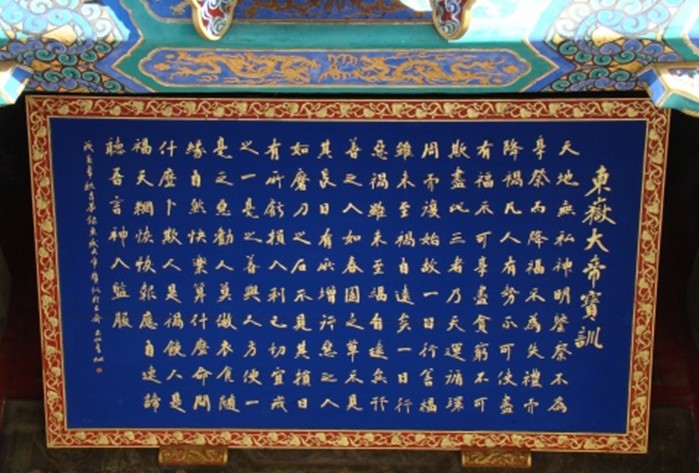 各殿前均掛有楹聯(lián)、匾額,集中體現(xiàn)了東岳信仰懲惡揚(yáng)善的精髓。楹聯(lián)多是東岳廟的一大特色景觀(guān)。原來(lái),廟內(nèi)多數(shù)殿堂前都掛有白底黑字、小篆字體的楹聯(lián)。它們既是對(duì)各殿各司神祇職能的詮釋?zhuān)彩侨藗儗?duì)理想生活的憧憬。在“善惡有報(bào)”的外衣下,楹聯(lián)的內(nèi)容折映出豐富的中國(guó)傳統(tǒng)倫理道德觀(guān)念。它們或言簡(jiǎn)意賅,發(fā)人深?。换蛏钊霚\出,雅俗共賞;或意蘊(yùn)悠長(zhǎng),蘊(yùn)含哲理,文化內(nèi)涵相當(dāng)豐富。