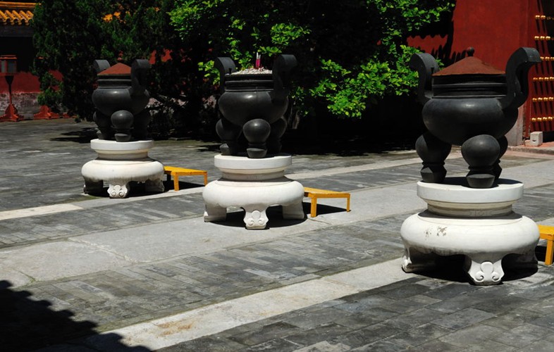 This small assortment of buildings, established in the 9th year of Emperor Jia Jing’s reign in Ming Dynasty (1530), consists of four big halls and two well pavilions. The main hall is called Holy Storehouse (Shen Ku), which stores Feng Ting – a sedan chair used to carry the enshrined god worship tablet for main Chinese Earth God (Huang Di Qi), and Long Ting – a sedan chair for carrying god worship tablets for side Chinese gods. The Holy Storehouse is also used to keep worship tablets temporarily when the God Worship House is under repair. The eastern side hall is called Sacrifice Utensils Storehouse (Ji Qi Ku), where store utensils for sacrifice ceremony. Musical instruments for the sacrifice ceremony are kept in the southern side hall, the Musical Instrument Storehouse (Yue Qi Ku). The western side hall, or Holy Kitchen (Shen Chu), is the place where sacrificial offering foods are made. The western and eastern well pavilions provide water respectively for Holy Kitchen and ditch surrounding Square Water Altar.