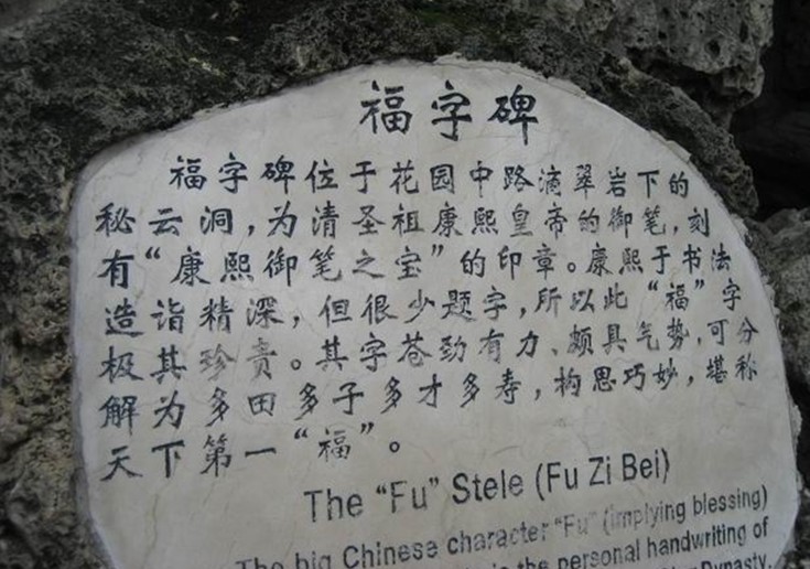 恭王府中”福”字碑藏在花園的假山內(nèi),這座假山是用糯米漿砌筑成的,非常堅(jiān)固,山上置兩口缸,缸底有管子通到假山上,通過(guò)往缸中灌水的辦法來(lái)增加院中的濕度。假山下有一幽靜的“洞天”,稱秘云洞,洞的正中有一康熙皇帝為其祖母孝莊皇后祝壽寫的“福”字碑,刻有“康熙御筆”之寶印。碑高1米左右,長(zhǎng)80厘米左右,貫穿整座假山。福字碑寓意福照全園,因?yàn)榭滴趿舸嫒耸赖念}字極少,所以福字碑倍顯珍貴。據(jù)說(shuō)當(dāng)年嘉慶查抄和珅府時(shí),想把這個(gè)福字移到皇宮,但是由于和珅設(shè)計(jì)巧妙,動(dòng)福就動(dòng)龍脈,這是皇帝最忌諱的,大怒之下,下令將假山封死,從此,康熙墨寶福字在所有的史書中消失了。直到建國(guó)初,周總理在一次接見(jiàn)外賓之后在花園無(wú)意中發(fā)現(xiàn)假山上面石頭的形狀象龍頭,按說(shuō)龍頭下必有國(guó)寶,于是馬上打電話給郭老(郭沫若),打開(kāi)被封的洞門,發(fā)現(xiàn)了福字碑,經(jīng)過(guò)文物部門的考證,確認(rèn)其為康熙當(dāng)年寫給孝莊太后的福字,而蓋在福字中央刻著“康熙御筆之寶”的大印已成為當(dāng)今世上所留的唯一一個(gè)完整的康熙大印印章。