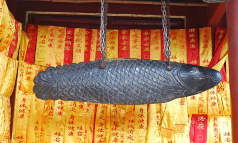 石魚:潭柘寺觀音殿西側(cè)有龍王殿,殿前廊上有一石魚,長(zhǎng)1.7米、重150公斤,看似銅,實(shí)為石,擊之可發(fā)五音,傳說(shuō)是南海龍宮之寶,龍王送給玉帝。后來(lái)人間大旱,玉帝送給潭柘寺消災(zāi)。一夜大風(fēng)雨時(shí),石魚從天而降,掉在院中。據(jù)說(shuō)石魚身上13個(gè)部位代表13個(gè)省,哪省有旱情,敲擊該省部位便可降雨?,F(xiàn)在寺中的石魚為后來(lái)復(fù)制的。