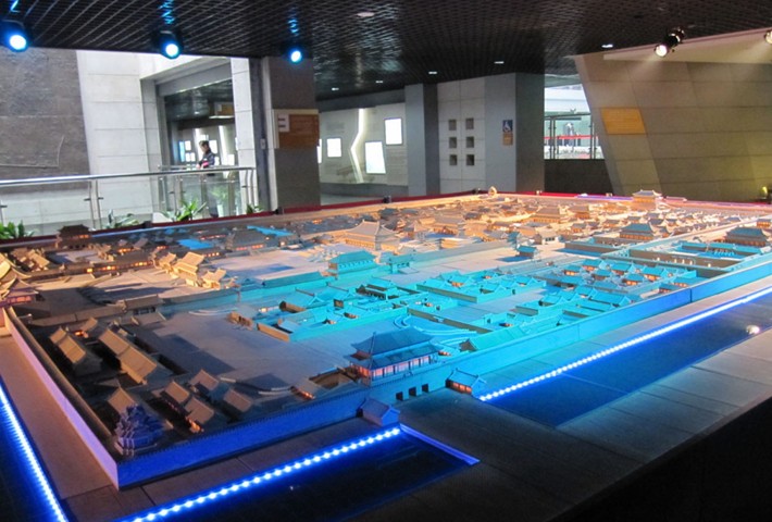 在展覽館的三層西區(qū),有北京古城變遷展區(qū),大量的照片、歷史地圖、漢代的井圈、明清的城磚、門墩、望柱頭等實(shí)物以及標(biāo)準(zhǔn)三進(jìn)四合院、各式門樓等模型,展現(xiàn)了自石器時(shí)代到近代,按不同時(shí)期,反映了北京城的歷史演變發(fā)展過程。沿展墻還布置了中國畫院劉洪寬所繪《天衢丹闕》工筆長卷,長53米,高0.7米,畫中人物5000多個(gè),建筑物超百棟,是表現(xiàn)上世紀(jì)三四十年代的老北京中軸線風(fēng)物圖。