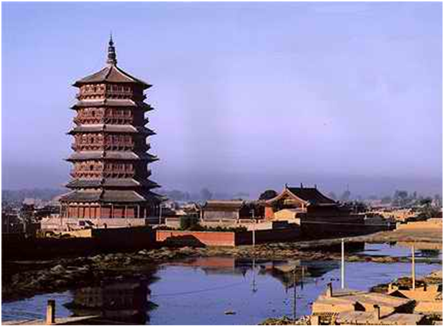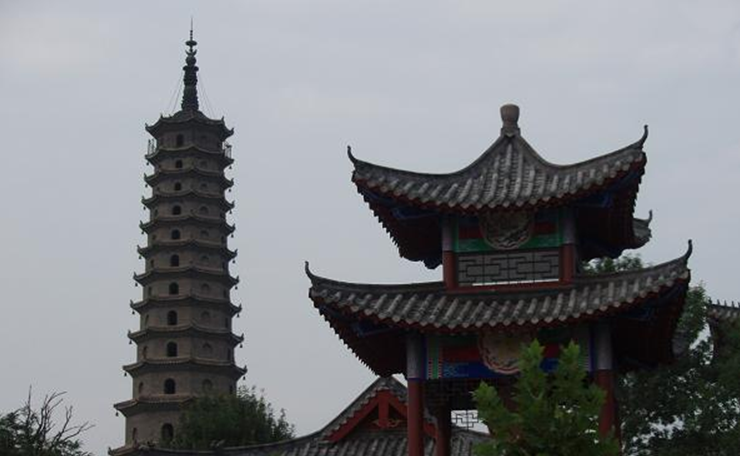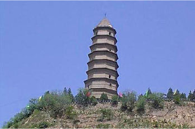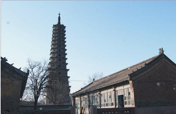 史稱唐塔,原名大覺寺塔,始建于唐貞觀十三年(公元639年),碑記為“尉遲敬德監(jiān)建”,距今已1300多年。原塔為八角密檐式磚石結構,青磚到頂,飛檐挑角,角系銅鈴,塔身13級,第一級南北各一門,其上每一級一南門,頂有相輪,全塔高約36米。明代維修時,吏部尚書楊巍撰有《重修大覺寺寶塔》,并刻石豎碑。