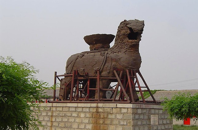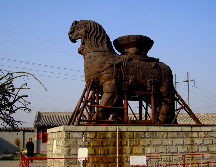 河北滄州鐵獅子鑄于后周廣順三年(公元953年),距今已有一千多年的歷史,采用“泥范明澆法”鑄成,具有較高的歷史科學(xué)和藝術(shù)價(jià)值,為全國重點(diǎn)文物保護(hù)單位。通寬5.35米,身長6.30米,身高6.6米,體寬3.0米,重約40噸,素有“獅子王”的美譽(yù),一千多年來,它飽經(jīng)滄桑,在古滄州,它曾被當(dāng)成神物供奉,享盡了香火;在烽火連天、哀鴻遍野的戰(zhàn)亂年代,又經(jīng)受了刀戈的砍殺,在獅體內(nèi)外斑痕累累。