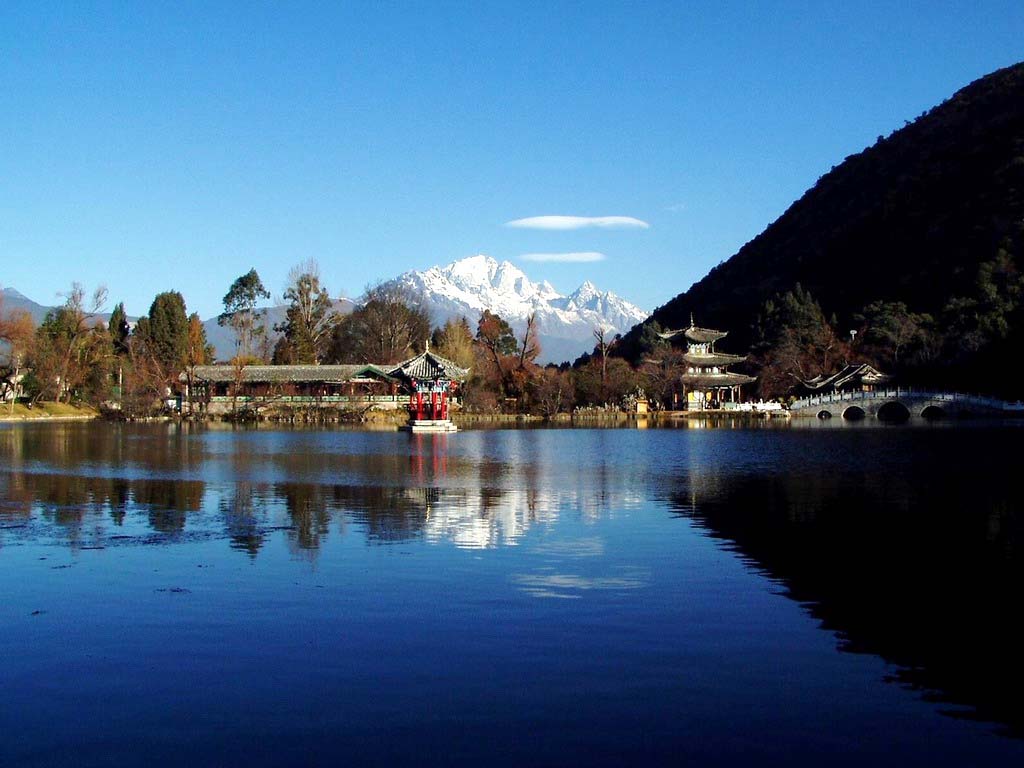 黑龍?zhí)豆珗@位于昆明北郊的龍泉山五老峰下,(亦稱龍泉山麓,太極山、五老山), 昆明黑龍?zhí)墩嫉孛娣e91.4公頃,距離市區(qū)約17公里。這里古木參天,泉壑幽邃,修竹茂林,潭深水碧,景色幽深。民間傳說(shuō)有黑龍王潛藏于此,故稱黑龍?zhí)兑喾Q龍泉山麓,距離市區(qū)約17公里。黑龍?zhí)秲?nèi)有罕見(jiàn)的大型梅園,是昆明的賞梅勝地,稱為“龍泉探梅”。園內(nèi)的“唐梅”相傳由南詔移植過(guò)來(lái),同安寧漕溪寺的“元梅”被認(rèn)為是云南最珍貴的古梅。在黑龍?zhí)秲?nèi)還有這樣的奇怪現(xiàn)象,潭以中間的石橋?yàn)榻缫环譃槎磺逡粷?,清濁之水互不相融,?jù)說(shuō)連魚(yú)兒都互不過(guò)界,頗為神奇。黑龍?zhí)妒怯忻牡澜虅俚兀譃樯舷聝捎^,從漢代的黑水祠演變而來(lái)。上觀始建于唐宋時(shí)期,始稱龍泉觀,下觀始建于明代,俗稱黑水宮。1997年,黑龍?zhí)队斡[區(qū)占地3.6公頃。1999年,黑龍?zhí)队酗L(fēng)景林51.4公頃,植有各種喬灌木12萬(wàn)多株。梅園28.5公頃,地栽梅5794株,盆栽梅1725盆。庭園占地6.9公頃,有喬木3973株,灌木48660株,修竹306叢。 1978年建苗圃,占地5.6公頃。建有杜鵑谷,植各種杜鵑10萬(wàn)多株。1998年又新辟一期綠化工程,占地33公頃,游覽區(qū)擴(kuò)大到45.4公頃。園內(nèi)有昆明市綠化委員會(huì)掛牌保護(hù)的古樹(shù)名木18株,是昆明市存有古樹(shù)名木最多的風(fēng)景名勝區(qū)。麗江黑龍?zhí)妒冀ㄓ谇《辏?737),其后乾隆六十年、光緒十八年均有重修記載。舊名玉泉龍王廟,因獲清嘉慶、光緒兩朝皇帝敕封“龍神”而得名,后改稱黑龍?zhí)?。?shī)云:“泉渙渙兮漣漪,問(wèn)何時(shí)最是可人?須領(lǐng)略月到天心,風(fēng)來(lái)水面;亭標(biāo)標(biāo)而矗立,看這般無(wú)窮深致,應(yīng)記取云飛畫(huà)棟,雨卷珠簾。”黑龍?zhí)兑云涮焐愘|(zhì),名列《中國(guó)名泉》、《中國(guó)風(fēng)景名勝》等書(shū),誠(chéng)不虛也。迎面見(jiàn)有一座涂金繪彩的牌樓,門(mén)口四尊石獅,肌理秀美,威武雄壯,過(guò)去守護(hù)木氏土司衙門(mén),1966年遷此守護(hù)玉泉。進(jìn)門(mén)往右,但見(jiàn)垂柳飄指,一潭澄碧,樹(shù)底天光云影,樹(shù)梢樓臺(tái)隱現(xiàn)。沿潭右堤至鎖翠橋,橋上古人有聯(lián)云:“驚濤撼樹(shù)飛晴雪,未雨垂虹臥曲波。”它生動(dòng)地描繪了橋邊景致。右邊橋下三孔飛瀑,水花四濺,上觀景區(qū)濤聲如雷,流向古城,玉水河畔,楊柳依依,濃蔭蔽日。往橋的左邊看,一座五孔石拱橋,長(zhǎng)虹臥波一般,將潭一分為二,玲瓏俊美的一文亭、得月樓分別屹立內(nèi)外潭心,四面臨水,有橋與岸上相連。此樓始建于清光緒二年(1876年),樓名取自古人對(duì)聯(lián)“近水樓臺(tái)先得月、向陽(yáng)花木早逢春”中三字。1963年重建時(shí),郭沫若為該樓題寫(xiě)了匾額“得月樓”三字及兩[1]副對(duì)聯(lián)。一副是集毛澤東詩(shī)詞句:春風(fēng)楊柳萬(wàn)千條,風(fēng)景這邊獨(dú)好;飛起玉龍三百萬(wàn),江山如此多嬌。另一副是郭老撰書(shū)的楹聯(lián):龍?zhí)兜褂呈澹瑵擙堅(jiān)谔?,飛龍?jiān)诘兀挥袼v橫半里許,墨玉為體,蒼玉為神。全聯(lián)僅三十字,卻寫(xiě)出了麗江黑龍?zhí)兜纳耥?,?shū)法遒勁而灑脫奔放,為公園增色不少。遠(yuǎn)處玉龍雪山倒遇潭中,可見(jiàn)“雪山四萬(wàn)八千丈,銀屏一角深插底”奇景。象山半壁也映入水中,使黑龍?zhí)渡街杏兴?,水中有山,山水相映,景色無(wú)比秀麗。