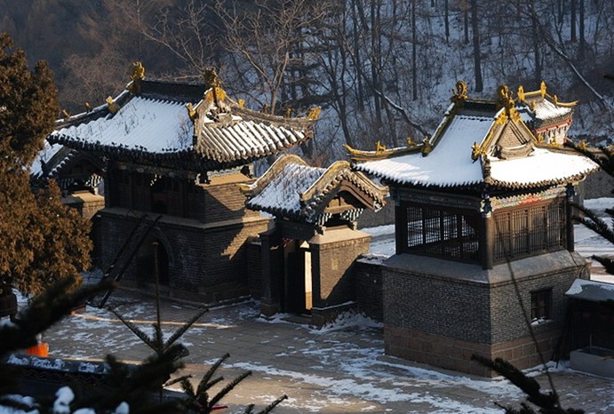 天地樓建在念佛堂前崖下,與牌坊相對(duì),歇山式,磚木結(jié)構(gòu),面闊三間,正脊兩端有吻,斜脊磚雕跑獸。檐下有柱頭,補(bǔ)間五鋪?zhàn)鞫饭?,施彩繪。底部是一個(gè)券門,門楣上磚雕二龍戲珠。券門外橫書“山門鎮(zhèn)靜”四個(gè)字。樓兩側(cè)各有一個(gè)角門。念佛堂是依而建,硬山式、磚木結(jié)構(gòu)。面闊五間,前有回廊。另修配房五間。