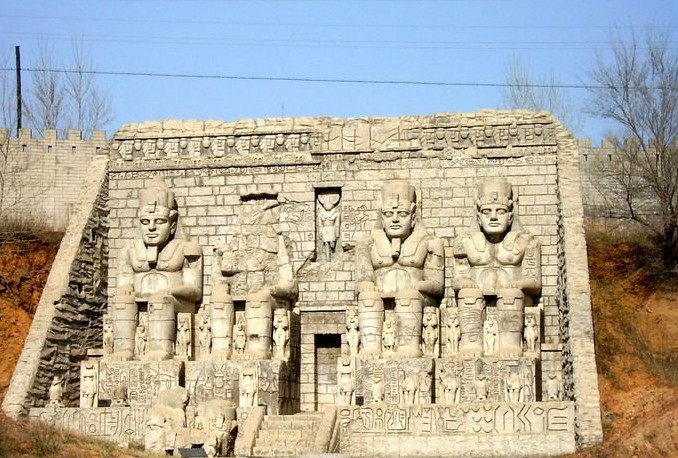 在埃及尼羅河西岸的峭壁上,雕鑿著四尊巨大的坐像,這四尊坐像均是古埃及第19王朝法老拉美西斯二世的雕像,每尊坐像高20米,其中一尊在戰(zhàn)爭(zhēng)中遭到破壞。門(mén)口上端雕刻的立像是太陽(yáng)神,這是炫耀法老巨大權(quán)力的紀(jì)念性雕刻,臉部屬于肖像雕刻,具有寫(xiě)實(shí)的特點(diǎn)。在尼羅河上航行可以看到這些巨人,并給人留下法老具有強(qiáng)大威力的難忘印象。坐像下面那些較小的雕像是法老的皇族。它建于公元前1275年。