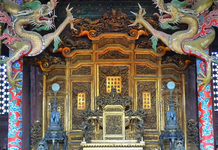 崇政殿:又稱“金鑾殿”,通稱“正殿”,是皇太極處理政務(wù)、接見使臣的場所,清代歷朝皇帝東巡祭祖時也在此聽朝理政。面闊五間,綠剪邊黃琉璃瓦,單檐硬山頂,前后有出廊,圍以石護欄。殿內(nèi)為徹上明造,和璽彩繪,寶座后有貼金龍扇屏風,旁為貼金蟠龍柱。殿外庭院左右有飛龍閣、翔鳳閣、東七間樓和西七間樓。