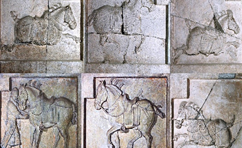 在祭壇東西兩廡房內(nèi)置有6匹石刻駿馬浮雕像,馳名中外,曾有詩云:“秦王鐵騎取天下,六駿功高畫亦優(yōu)?!边@是李世民自己選定的題材。他在隋亡以后,為統(tǒng)一割據(jù)的局面,鞏固唐王朝新建的政權(quán),南征北戰(zhàn),馳騁疆場,他騎過的六匹馬,聯(lián)系他的戰(zhàn)叻。據(jù)說當(dāng)時(shí)擔(dān)任營山陵使、工部尚書、著名工藝家、美術(shù)家閻立德起圖樣,由筑陵石工中的高手雕鐫而成的。這六具石雕駿馬是在平面上起圖樣,雕刻人馬形狀的半面及細(xì)部,并使高肉突起,稱之浮雕,也叫“高肉雕”。每邊三具,皆背靠后檐墻而立。據(jù)記載,原石在每塊上角有歐陽詢書太宗自撰的馬贊詩,隨后另有殷仲容隸書刻于座上,這些今俱不可見,原詩收入《全唐文》中。六駿的名為“特勒驃”、“青騅”、“什伐赤'、“颯露紫”、“拳毛馬咼”、“白蹄烏”?,F(xiàn)存西安市碑林博物館,其中“颯露紫”、“拳毛馬咼”二駿,于1914年被盜運(yùn)美國賓夕法尼亞大學(xué)博物館。昭陵六駿刻于貞觀十年,各高2.5米,橫寬3米,皆為青石浮雕,姿態(tài)神情各異,線條簡潔有力,威武雄壯,造型栩栩如生,顯示了我國唐代雕刻藝術(shù)的成就。在“颯露紫”中表現(xiàn)了唐太宗在與王世充作戰(zhàn)時(shí)為流矢所中,丘行恭進(jìn)前為他拔箭那種親切形象。昭陵的這些石刻在品類、造型及題材上,既不取生前儀衛(wèi)之形,也不用祥瑞、辟邪之意,獨(dú)具一格,所有石刻都是寫實(shí),富有政治意義的不同凡響之作。
