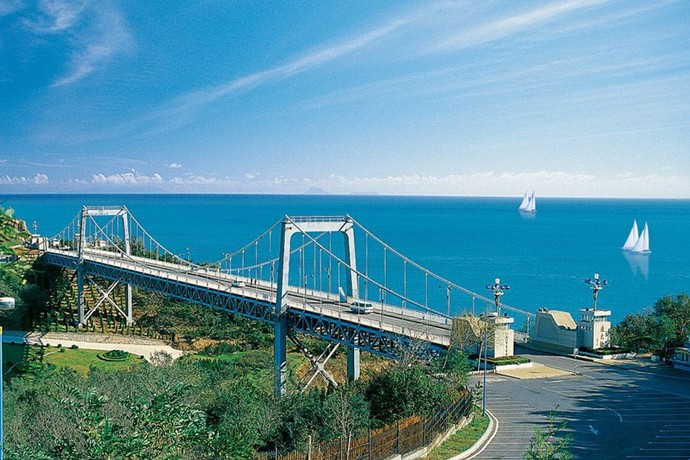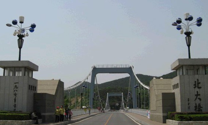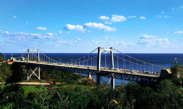 北大橋位于大連海濱風(fēng)景區(qū)中的老虎灘景區(qū)與燕窩嶺景區(qū)之間,是一座近海臨山橫跨山谷的旱橋。它是貫穿整個(gè)大連海濱風(fēng)景區(qū)東西濱海路的要沖,而且也是老虎灘景區(qū)西部和鄰近的燕窩嶺景區(qū)中一壯觀秀麗的風(fēng)景點(diǎn)。 該橋?yàn)槿绾?jiǎn)支加勁桁架懸索橋,全長(zhǎng)230米,中跨跨徑132米,橋?qū)?2米,其中車(chē)行道寬為8米。主索矢高13.2米,矢跨比1:10。