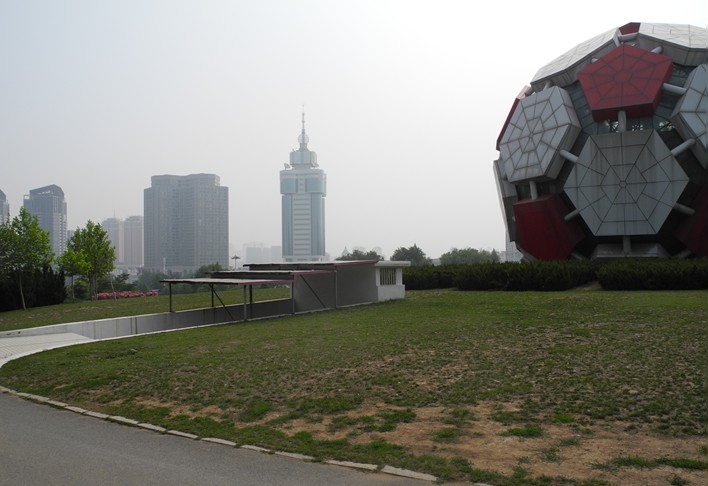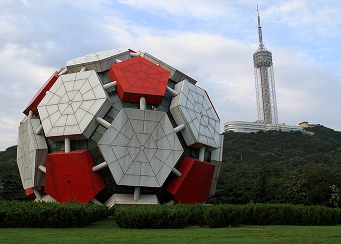 球形建筑藝術(shù)館里面陳列著大連各種建筑圖形,因為大連是足球城,所以它的外形便造成了紅白相間的球體。球體直徑19.6米,高21米。