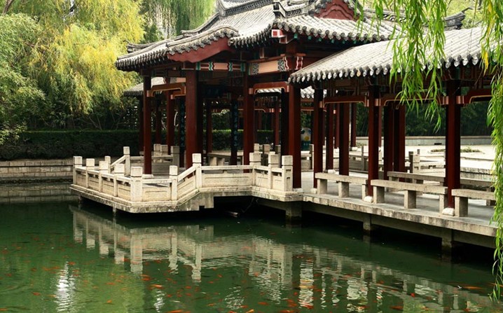 五龍?zhí)?,位于濟南舊城西門外,洛源橋北,南臨趵突泉,北接大明湖。潭周名泉眾多,形成五龍?zhí)度?,為濟南四大泉群之一,?nèi)有泉池二十七處。公園的建園風格兼具有南北造園之精華,是以潭池溪港等景觀構成,質樸野逸為特點的園林水景園。此水域風景秀麗,柳絲醮波,鳴禽啾啾,荇藻漂浮,錦魚嬉戲,素有“夾岸桃花,恍若仙境”之美譽,風景幽雅獨具特色。