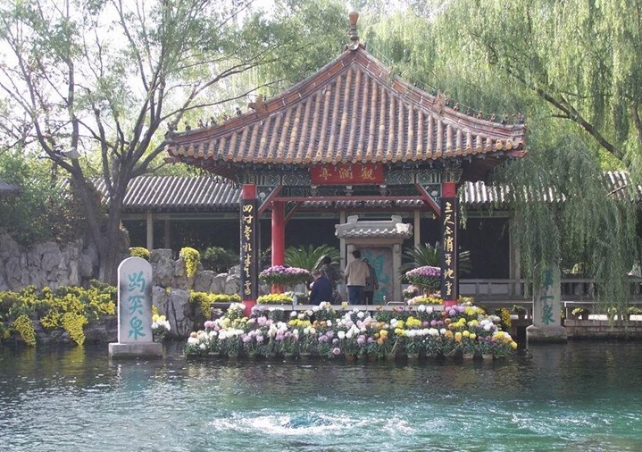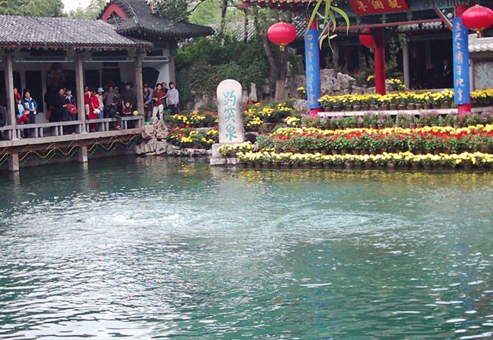 清代文學(xué)家蒲松齡所贊:“海內(nèi)之名泉第一,齊門之勝地?zé)o雙。”趵突泉池中小泉眾多,水泡如泄珠璣,有的簇簇,有的串串,飄飄悠悠。水中青藻浮動(dòng),錦魚穿梭。冬季,水氣蒸騰,朦朦朧朧,妙不可言。池岸以石砌壘,四周近水樓臺(tái),與池相映;小橋回波,亭榭探水,曲廊蜿蜒;山石挺拔,綠柳輕蕩。游人憑欄俯瞰,盡得水趣。泉畔還有許多名人題刻,為名泉增添了頗濃的文化氛圍。