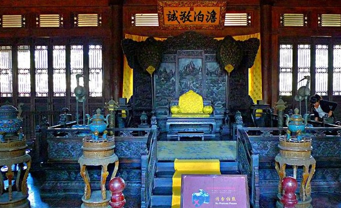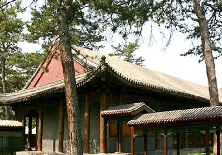 大殿建在大理石砌筑的臺基上,為青磚布瓦卷棚歇山式建筑, 古樸典雅,莊重肅然。殿內(nèi)陳設(shè)豐富、素雅、凝重,與周圍的環(huán)境十分協(xié)調(diào),顯示出皇家典雅的氣派。殿內(nèi)陳設(shè)有成堂的家具、圖書、鐘表和古玩。殿中懸"澹泊敬誠"匾。中央為紫檀雕欄須彌座地坪,上置有紫檀浮雕耕織圖圍屏、紫檀彌勒寶座、足踏、座褥、靠背、迎手、羽葆、蟠龍、垂思香筒、仙鶴、香幾、印盒等,周圍有薰?fàn)t、爐幾、琺瑯爐、東大案、西大案,案上有鐘表、青花貫耳尊、霽蘭天球瓶、青花雙耳尊、五彩山水鹿頭尊、紫檀雕龍大立柜等。