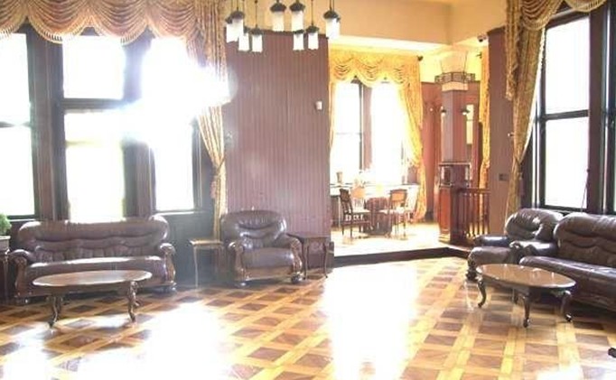 由西門進(jìn)入既為第二層,習(xí)慣稱為一樓,內(nèi)設(shè)過(guò)門廳、中廳、大廳、會(huì)議室、舞廳、餐廳和花房等組成,大廳高為9米,頂部懸以華麗的吊燈。大廳的墻壁上裝飾銅雕藝術(shù)品和油畫,墻下部圍以棕色的護(hù)板;一側(cè)墻角處是一個(gè)嵌著綠色玉石的壁爐,另一角擺放著一架古老的德國(guó)三角架鋼琴,大廳墻壁上掛有一只鐘表是德國(guó)著名鐘表設(shè)計(jì)家瓊漢斯設(shè)計(jì)的,它有一個(gè)特點(diǎn)是一小時(shí)報(bào)四次時(shí),每一刻響音樂(lè),整點(diǎn)是敲鐘點(diǎn)。整個(gè)大廳充滿了古樸濃郁的西方情調(diào)。