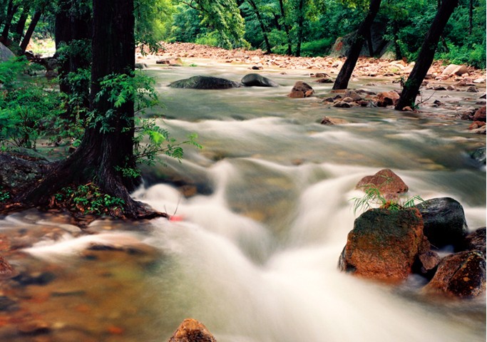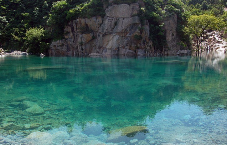 北九水以其麗山秀水繪就的優(yōu)美畫廊,馳名中外。嶗頂源泉之水從海拔1100多 米的高峰順勢而下,中途又匯集了眾多的溪流,凌空瀉入靛缸灣,又從靛缸灣溢出,沿著長長的深山峽谷,彎彎曲曲,時(shí)急時(shí)緩,時(shí)聚時(shí)散,奔騰而下。這樣一來,再配以兩側(cè)群峰聳峙,禽鳥啼鳴,奇光薈萃,綠樹成蔭,山與水相互纏繞,形成了一步一景、一灣一色的瑰麗畫廊風(fēng)光。