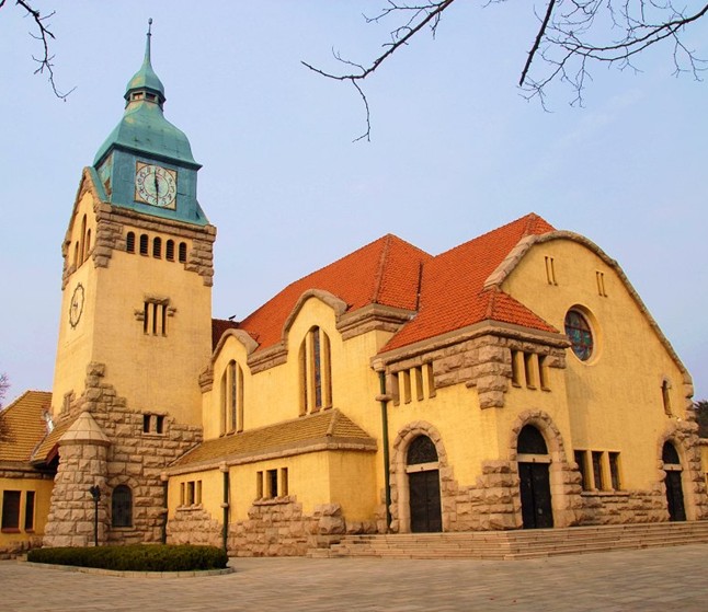 教堂由德國膠澳總督府出資,于1908年4月19日奠基,1910年10月23日落成。教堂頂部有高39米的報時鐘樓,俗稱“鐘表樓”。它是一個典型的德國古堡式建筑,占地1000平方米,由鐘樓和禮堂兩部分組成。鐘樓高39.10米,登樓可觀賞島城的海天秀色。鐘樓上的巨型鐘表,給原本肅穆的教堂又增添了幾分神秘和莊重。禮堂寬敞明亮,可容千人之眾。18米高的大廳兩側(cè)分為樓上樓下兩層,裝飾十分精美典雅,置身其中給人以神圣之感,不愧是完美的基督教建筑藝術的佳作。在堂區(qū)院內(nèi)建有二層樓房兩幢。一幢是該堂的附堂,一幢是傳教士的住宅。教堂前的廣場平坦寬闊,四周綠樹成蔭,周圍錯落有致地分布著各種西式建筑,更加襯托出教堂建筑的宏偉。每當晨曦漸擴,熹抹東天之時,遠山近樹、綠頂黃墻在曉霧中時隱時現(xiàn),此情此景,不由令人疑為身處異域。沿著巖丘的窄階拾級而上,教堂堅固厚重的墻壁、半圓拱形花崗巖窗框、陡斜的紅色屋頂以及綠色尖頂?shù)溺姌潜闱逦卣宫F(xiàn)在眼前。用厚重的花崗巖壘砌的墻基凝重粗獷,使整個教堂的輪廓顯得清晰簡潔,給人一種宗教建筑特有的美感。