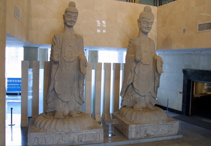 在青島歷史文化博物館的正門大廳內(nèi),矗立著兩尊北魏(公元500—550年)時(shí)期的石佛像,距今已有1500余年的歷史。佛像身高一丈八尺,重約30噸,俗稱“丈八佛”。頭部雕高肉髻,面部瘦削清秀,深目高鼻,眉間有白毫相,其神態(tài)祥和、超然。長(zhǎng)頸,內(nèi)著僧祗支,胸前束僧祗支帶,外披褒衣博帶式長(zhǎng)衣,衣紋雕刻成“v”形斷面。雙手施無(wú)畏與愿印。跣足立于蓮花座上,蓮座下雕四方形的須彌座。石佛像造型優(yōu)美,雕刻技法嫻熟,衣紋細(xì)致柔和,神態(tài)栩栩如生。充分表現(xiàn)出北魏孝文帝漢化政策的施行,反映到佛教雕塑藝術(shù)上的風(fēng)格特點(diǎn)。兩尊石佛像最早安放在山東臨淄縣龍泉寺內(nèi)。