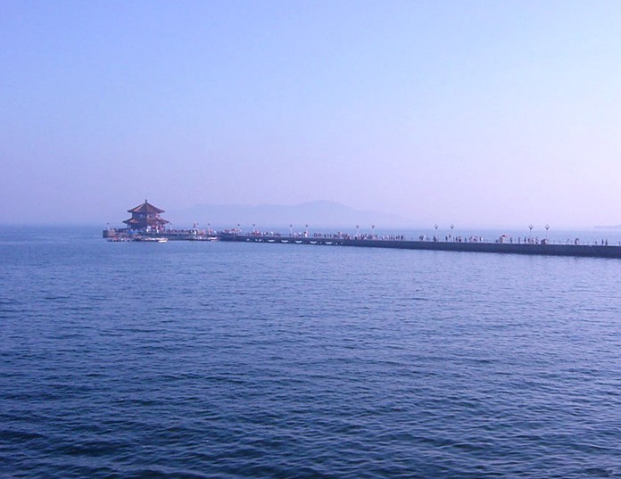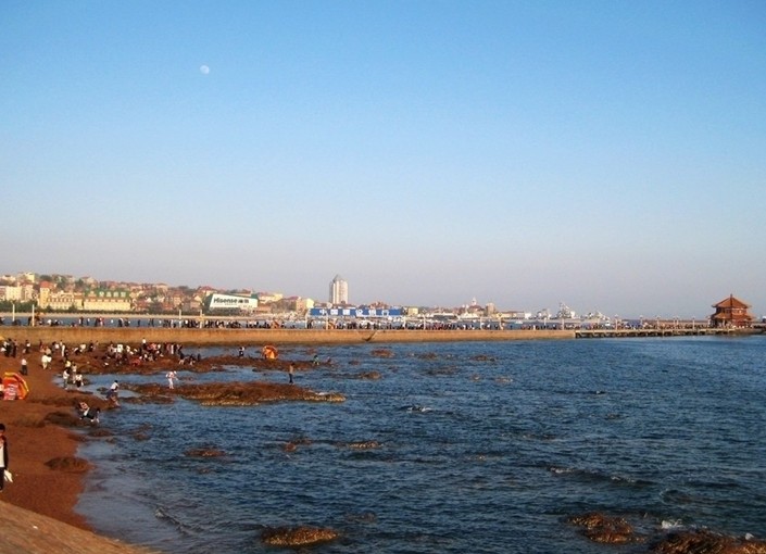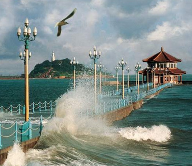 棧橋是青島的象征。位于青島灣中,與市內(nèi)最繁華的中山路成一條直線,由海岸前伸入海,素有“長虹遠引”之美譽。棧橋初建于光緒十八年(公元1892年),是青島最早的碼頭。經(jīng)1931年改建和1985年整修,現(xiàn)寬8米,全長440米。版權(quán)所有山東聊城聊之旅國際旅行社有限公司,轉(zhuǎn)載必究!橋南端筑半圓形防波堤,堤內(nèi)是一座具有民族風(fēng)格的兩層八角亭,金瓦朱壁,盔頂飛檐,題名“回瀾閣”。棧橋劃波斬浪,像一條長龍橫臥于碧海銀波。循橋漸入,仿佛走進大海的懷抱;佇立閣旁,層層巨浪澎湃涌來,拍打堤壩,擊起萬千碎玉;入閣內(nèi),沿螺旋樓梯登到樓上,四周盡是寬敞的大窗,放眼望去,又是另一番怡人風(fēng)景,“飛閣回瀾”因此被譽為“青島十景”之一。