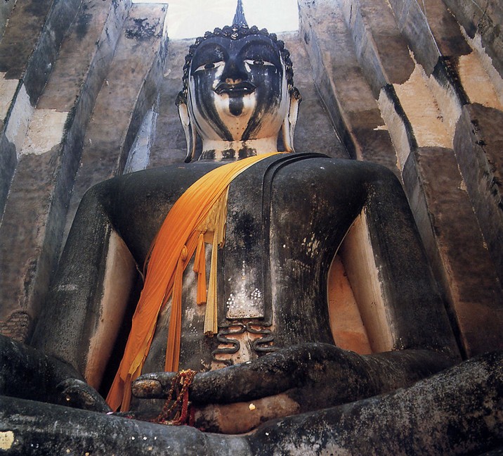在果園和谷地的中間,是茂盛的大草原,草原延伸過(guò)一個(gè)山谷,與山谷平行的是一條發(fā)源于中國(guó)邊境的山上的河流,湄公河即由此流過(guò)。在一片芒果和椰子棕櫚的風(fēng)景之后,有一個(gè)聳立的高塔,帶著尖塔的圓屋頂連同巨大的雕像一起矗立在下層叢林中,幾乎覆蓋了一群更小的建筑遺跡,即一個(gè)古城所留下的歷史遺跡。矗立在城墻和護(hù)城河旁邊的建筑物便是神殿、寺廟和修道院,仿佛最初建造這個(gè)城市并且利用泥土和樹木做房屋的人們只想把他們的精神傳給子孫后代似的。素可泰是這個(gè)城市的名字,它在13世紀(jì)和15世紀(jì)時(shí)期是國(guó)家的首都,它的全部歷史便是泰國(guó)歷史的開端。公元13世紀(jì)中葉,隨著王國(guó)的建立,新的朝代開始了,泰國(guó)人逐漸壯大,泰國(guó)的領(lǐng)土擴(kuò)展到整個(gè)地區(qū),從緬甸(東南亞國(guó)家)一直到柬埔寨,向南部一直擴(kuò)展到馬來(lái)西亞半島那么遠(yuǎn)。在200年的時(shí)間里,素可泰一直是這種擴(kuò)展力量背后的精神支柱。公元15世紀(jì)的上半葉,這個(gè)城市開始走向衰落。取而代之的是南部的大城得以建立,逐漸成為國(guó)家的政治中心。