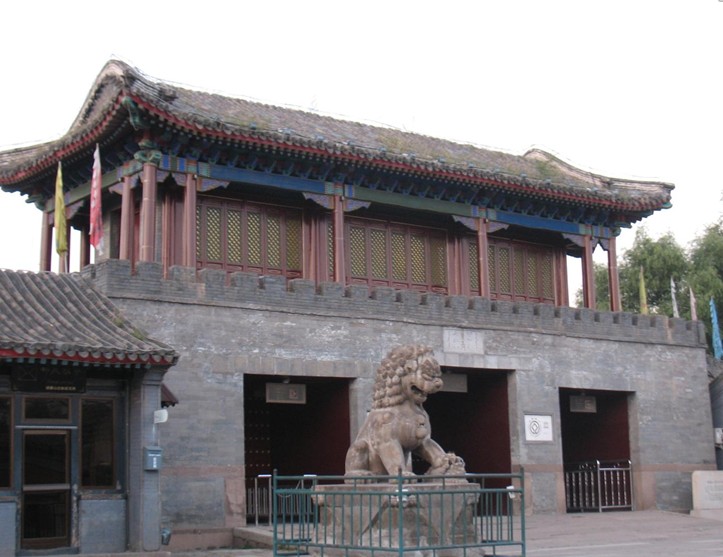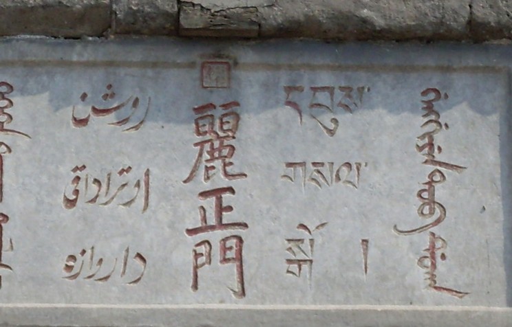 門(mén)前列石獅和下馬碑,迎面有紅照壁,門(mén)上有閣樓,下有3門(mén),高敞宏偉。中門(mén)上方有乾隆題額“麗正門(mén)”三字,取《易經(jīng)》“日月麗乎于天”之意,用漢、滿、蒙、藏、維五種文字刻成。它和門(mén)內(nèi)上方乾隆題詩(shī)“兩字新題標(biāo)麗正,車書(shū)恒此會(huì)遐方”,象征著國(guó)內(nèi)各民族團(tuán)結(jié),國(guó)家強(qiáng)盛、統(tǒng)一。