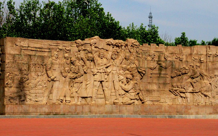 大廳正中央的鑄銅雕像《走向勝利》,表現(xiàn)了中共中央毛澤東和劉少奇、朱德、周恩來、任弼時五位書記的領(lǐng)袖風(fēng)采;墻屏上毛澤東主席關(guān)于平津戰(zhàn)役作戰(zhàn)方針的浮雕手跡熠熠生輝;環(huán)周巨幅壁畫《勝利交響詩》反映了東北、華北兩大區(qū)軍民英勇奮戰(zhàn)、奪取戰(zhàn)役勝利的宏大場面。