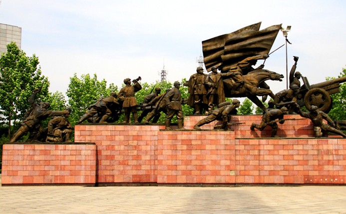 紀(jì)念廣場總體環(huán)境藝術(shù)以勝利為主旋律。兩根高大花崗巖圓柱構(gòu)成勝利門,柱頂分別佇立著人民解放軍東北野戰(zhàn)軍和華北軍區(qū)部隊?wèi)?zhàn)士雕像。兩壁反映軍民團結(jié)奮戰(zhàn)、歡慶勝利的花崗巖浮雕墻分列勝利門兩旁。廣場中央豎立著高64米的勝利紀(jì)念碑,不銹鋼三冷刺刀直插云霄。廣場東西兩側(cè)的大型鍛銅群雕,烘托出人民戰(zhàn)爭的磅礴氣勢。