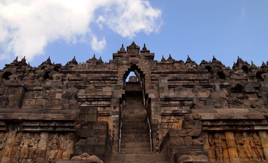 沒(méi)有文字記錄誰(shuí)是婆羅浮屠的建造者,也不知道為何而建。通過(guò)比較佛塔隱式地基的浮雕和王室族譜的銘文,人們估計(jì)佛塔建造于公元八和九世紀(jì)。婆羅浮屠可能于公元800年建成。