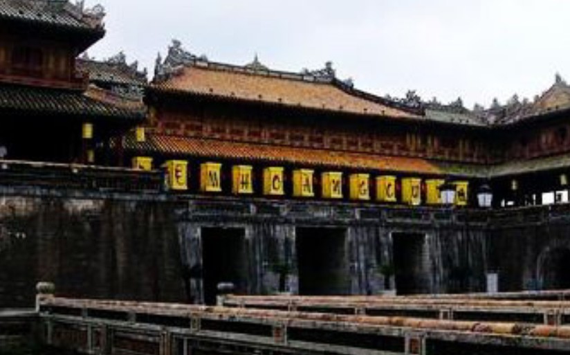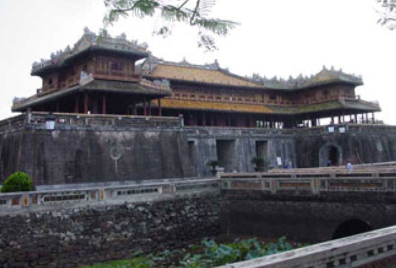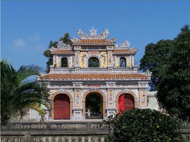 越南順化故宮正門。規(guī)模比中國北京故宮的午門小,但其式樣基本一樣。平面呈冂形,下有高大的磚石墩臺(tái),臺(tái)正面圍以垛墻。墩臺(tái)有5門,正中門高5.32米,寬3.28米,門正中上方有“午門”兩個(gè)大字。當(dāng)初字外包金,1943年12月10日包金被竊。墩臺(tái)上建樓5座,名五鳳樓,樓分兩層,氣勢(shì)巍峨。下層正中是“御座”。上層為各宮人觀禮之所。當(dāng)時(shí),午門只在慶典節(jié)日開放。午門也是阮氏王朝被埋葬的見證,1945年8月30日阮朝末代皇帝被迫在此正式宣布遜位,并把金印和寶劍交給越南臨時(shí)政府代表團(tuán)。午門建于阮朝明命十四年(公元1833年),啟定三年(1921年)重修??箲?zhàn)期間遭炮火破壞,現(xiàn)已修復(fù)。以前,阮朝嘉隆初年曾在午門現(xiàn)址建有南闕臺(tái)。