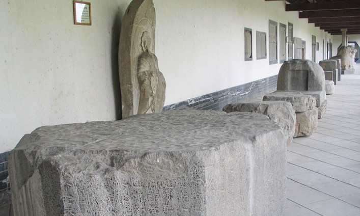 北魏阿彌陀佛說法石造像,高5.85米,現(xiàn)藏青島市博物館,俗稱丈八佛。庭院內(nèi)露天陳列許多珍貴文物,其中院東側(cè)護(hù)欄內(nèi),坐東面西、南北向并列4尊雕刻精美的北朝石刻造像和兩座石碑。中間兩尊石像高達(dá)一丈八尺,故稱“丈八佛”。佛像身軀微傾,雙目細(xì)長(zhǎng),彎如新月,目光下視,面含微笑,兩腳跌立于刻有蓮花的石座上,顯示了距今1400多年前北朝時(shí)代宗教藝術(shù)的偉大成就。
