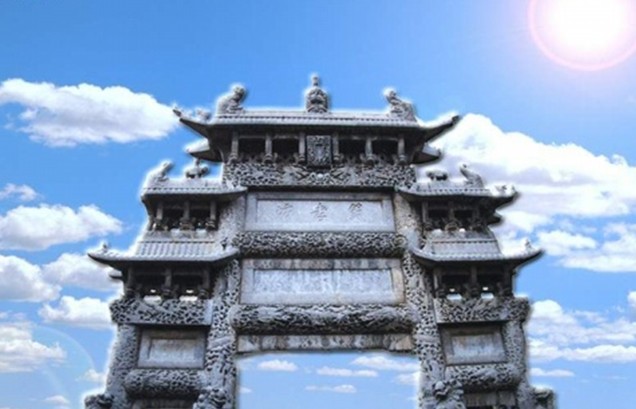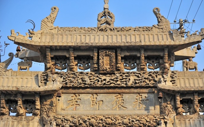 因雕有一百個不同書體的壽字而得名。坊以青色魚子狀石灰?guī)r構(gòu)成,通高l3米、寬8米,四柱三間三層樓閣式建筑。其獨特之處是:坊座雕有8頭矯健雄獅昂首遠(yuǎn)望,8條出水蚊龍繞柱回舞,額枋上飾滿盛開牡丹,與正間上下額枋祥云間翩翩飛舞的5只透雕仙鶴、次間上額枋浮雕的相對翱翔之鸞鳳構(gòu)成了具有無窮魅力之藝術(shù)佳作,寓意福壽萬年、富貴無媲或喜上眉梢。