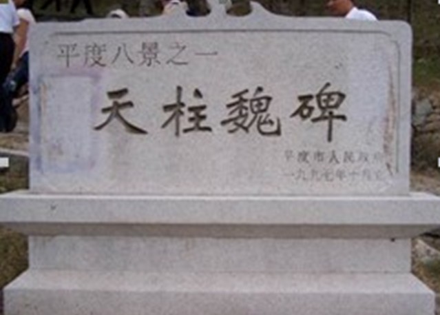 天柱山魏碑位于平度大澤山天柱山南,又稱天柱山摩崖石刻,為國家重點文物保護單位。碑文刻在一塊天然巨石上,高3.2米,寬1.5米,陰文20行,每行40至50字不等,共計881個字,碑文1400余年至今仍清晰可辨。該碑是北魏永平四年(511)光州刺史鄭道昭所書鐫,碑文記述了其父持節(jié)將軍兗州刺史南陽公鄭羲的生平事跡和著述。
