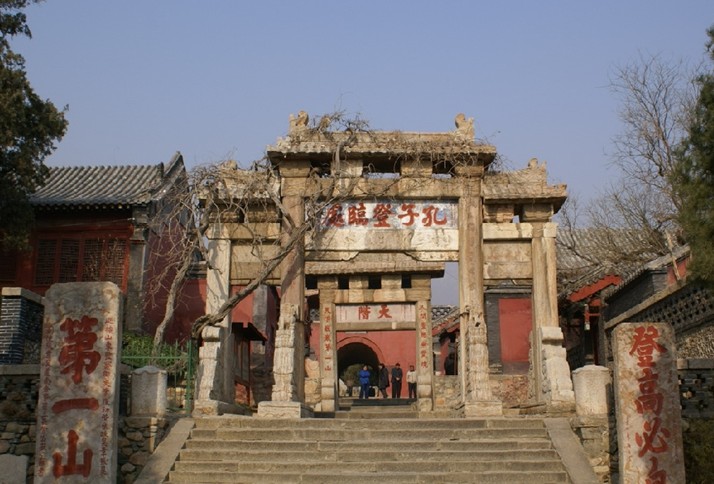 孔子登臨處位于泰山一天門北,為四柱三門式跨道石坊。古藤掩映,典雅端莊,額題“孔子登臨處”五大字。明嘉靖三十九年 (1560)始建。柱聯(lián)曰:“素王獨(dú)步傳千古,圣主遙臨慶萬年”。坊兩側(cè)分立兩碑,東為明嘉靖間濟(jì)南府同治翟濤題“登高必自”碑;西為巡撫山東監(jiān)察御史李復(fù)初題“第一山”碑。北側(cè)為兩柱單門的“天階”坊。