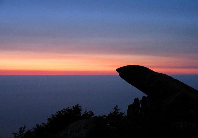 探海石,是位于岱頂?shù)囊粔K突兀伸出的怪石,其上可觀云海玉盤奇景。夏天,雨后初晴,大量水蒸氣蒸發(fā)上升,加之夏季從海上吹來的暖溫空氣被高壓氣流控制在海拔 1500米左右的高度時(shí),如果無風(fēng),在岱頂就會(huì)看見白云平鋪萬里,猶如一個(gè)巨大的玉盤懸浮在天地之間。遠(yuǎn)處的群山全被云霧吞沒,只有幾座山頭露出云端;近處游人踏云駕霧,仿佛來到了天外。