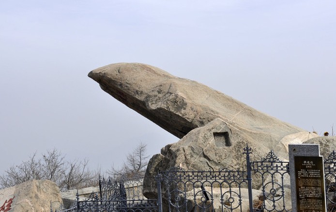 當(dāng)你登上五岳之尊的泰山之巔,你一定會(huì)去玉皇頂東側(cè)的觀日峰,因?yàn)槟抢锸浅客粘銎嬗^,暮觀晚霞美景,晴賞山河壯麗,陰看彩云飛渡的最佳去處。在日觀峰上,有一巨石向北(偏西8°左右)斜上橫出,名為拱北石,仿佛一只報(bào)曉的雄雞,翹首以待,猶如起身探海,故又名探海石。拱北石平地向前探出兩丈多遠(yuǎn),象一把帶鞘的利劍斜刺蒼天。長近10米、寬約3.2米、厚為1.5米左右。此石與地面夾角為30°,高出周圍地面,其北、東兩面均為懸崖峭壁,顯得神奇而又險(xiǎn)峻。學(xué)者王克煜說,探海石是岱頂著名景點(diǎn)之一,也是泰山的象征和重要標(biāo)志。它像一只報(bào)曉的雄雞,氣宇軒昂地佇立在泰山之巔,翹首以待,為世人迎來輝煌的黎明。清代著名清官李興祖曾為此留下“才聽天雞報(bào)曉聲,扶桑旭日已初明。蒼茫海氣連云動(dòng),石上有人別有情”的詩句。