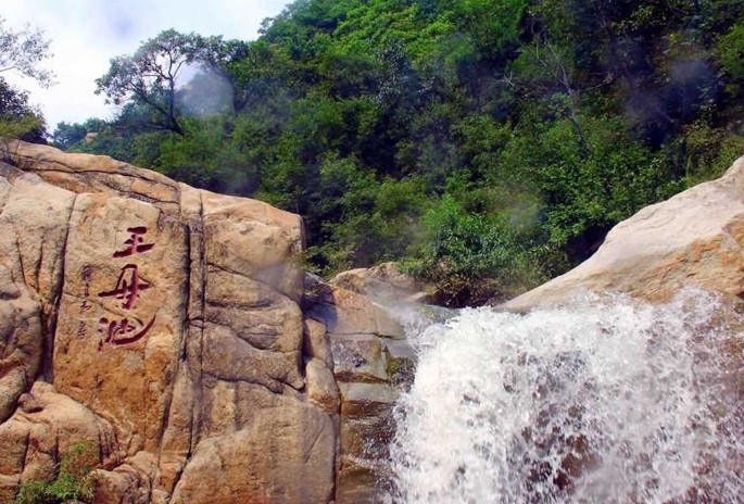 王母池建在中溪西畔,溪旁曾建有王母梳洗樓,中溪之水至此便改名為“梳洗河”。河上原有一座王母橋,早廢。建國(guó)后又在河上筑一座石橋,取名“八仙橋”。橋東北立壁下有一石洞,稱“呂祖洞”,相傳呂洞賓曾在此煉丹,洞中嵌有碑碣,說(shuō)是呂洞賓的題詩(shī),但文辭粗陋,不足為觀,無(wú)聊文人所為之也。呂祖洞之北是虎山水庫(kù)的大壩,大壩同龍?zhí)端畮?kù)的壩一樣也為頂溢式,所不同的是壩上又建了一條近百米長(zhǎng)的觀瀾橋,每至雨季,6個(gè)橋墩把水分為七派,形成7條瀑布,只有見過(guò)的人才知道,人造的景觀只要恰到好處,也是十分動(dòng)人的。這虎山書庫(kù)與西溪的龍?zhí)稌鴰?kù)一東一西,一虎一龍,扼守著山前的兩條溪谷,積起了兩泓碧波,就像是在泰山腳下鑲上了兩塊晶瑩的綠翡翠。