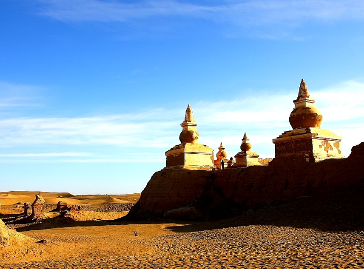 在黑水城眾多的建筑中,宗教建筑是這座古城的一大特色。黑水城,曾是一個(gè)多民族聚居的城市。歷史上曾建造過(guò)許多宗教寺院。有佛教、道教和伊斯蘭教等不同的建筑。其中以佛教建筑最多,而且占地面積也最大。版權(quán)所有山東聊城聊之旅國(guó)際旅行社有限公司,轉(zhuǎn)載必究!在西北角的城墻上,至今還聳立著5座寶瓶似的佛塔。最高的一座達(dá)13米。佛塔是用土坯壘成,雖經(jīng)數(shù)百年的風(fēng)沙侵襲,今天依然聳立云端,成為黑水城獨(dú)具魅力的標(biāo)志。