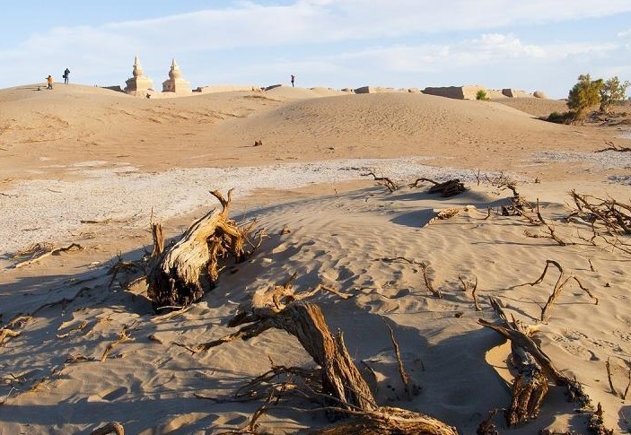 1350年前后,這里的情況發(fā)生了巨大的變化。昔日的綠洲,被沙漠吞噬,變成了一片荒漠。昔日繁華昌盛的黑水城也變成了一座廢城。現(xiàn)在它們的痕跡依稀可辨。磚石,瓦塊,陶瓷殘片,鐵器,雕刻,泥佛,風(fēng)化的白骨,破裂的石磨,塊壘等當(dāng)年的遺物。在古城遺址的西北角上,端坐著12米高的西藏覆缽式佛塔,古樸,圓融,安詳,是黑城的標(biāo)志性建筑。城內(nèi),荒涼滿目,流沙下遍布官邸、寺廟和民居的頹垣斷壁,到處都散落著各種瓷器和碎片。黑釉刻花、白釉褐彩,以及鈞瓷和南方的龍泉瓷等等。城外還有幾座殘缺不全的喇嘛塔,像是守城的衛(wèi)士肅然而立。
