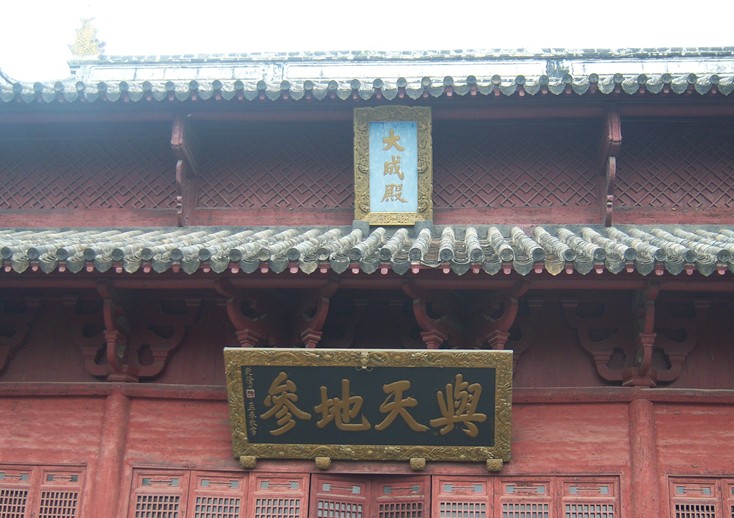 下泮橋即至大成門。此門系門廳式梁森構(gòu)架,闊三開間。硬山到頂,筒瓦頂蓋,正脊兩面三刀端裝飾鰲魚,四角凌空飛翹。門廳前后之間設(shè)壁隔內(nèi)外廳,并列辟門三道,中門屹立一對(duì)石獅,兩邊側(cè)門各置兩只石鼓。毗連門兩面三刀側(cè)的崇圣祠、土神祠、各三間,坎墻上軒要格通窗。廳、祠并列相依,刪繁脫俗,獨(dú)具匠心。